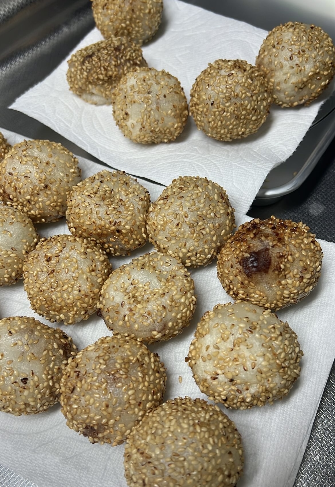 ゴマ団子揚げる前めちゃめちゃひび割れててあんこ見えて「終わったわ🎶(タタンッ)」やった。揚げたらなんとかなりました!