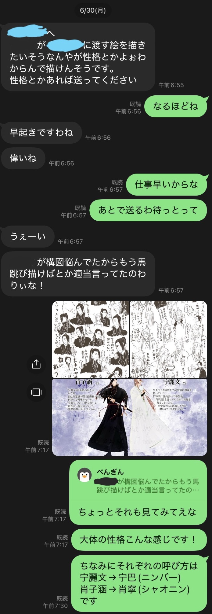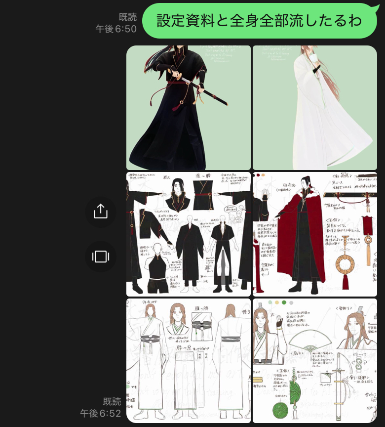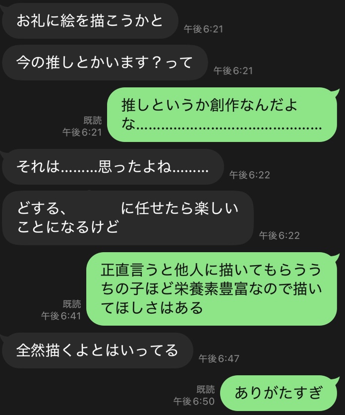 以前私が推しグッズを断捨離してる時に友人にLINEしてて「そういやこの子○○(私の推しでもある)推してたな〜」と思い出して聞いたところ欲しがっていたそうなのであげたんですよ。でそのお礼に「推し描くから教えて」と聞かれ 子麗しかいねえなと思い 言いました。