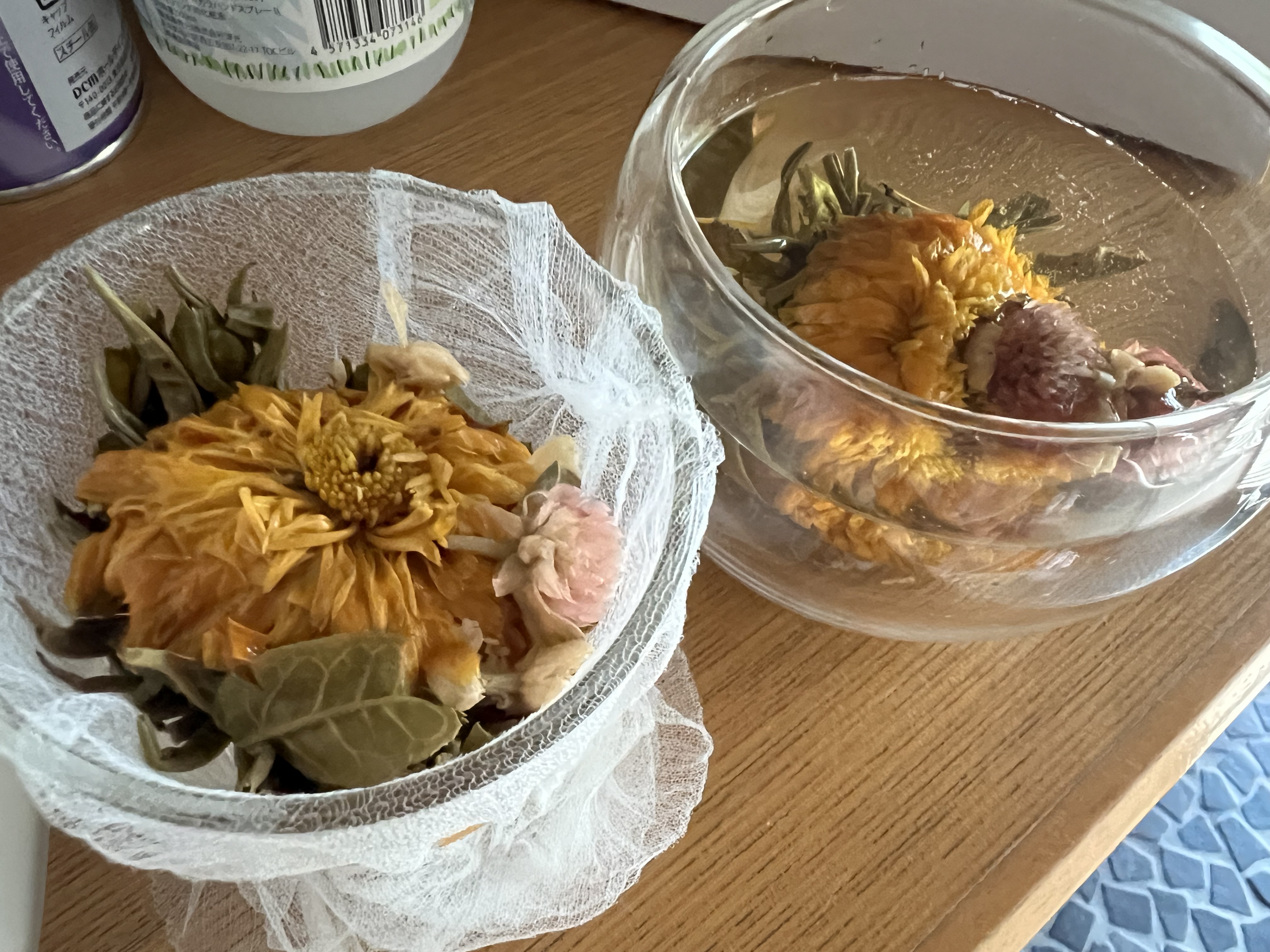帰宅したらドライフラワー作ろ!て真っ先に道具を並べて準備しました。そうです、飲茶してた工芸茶の花です🌸