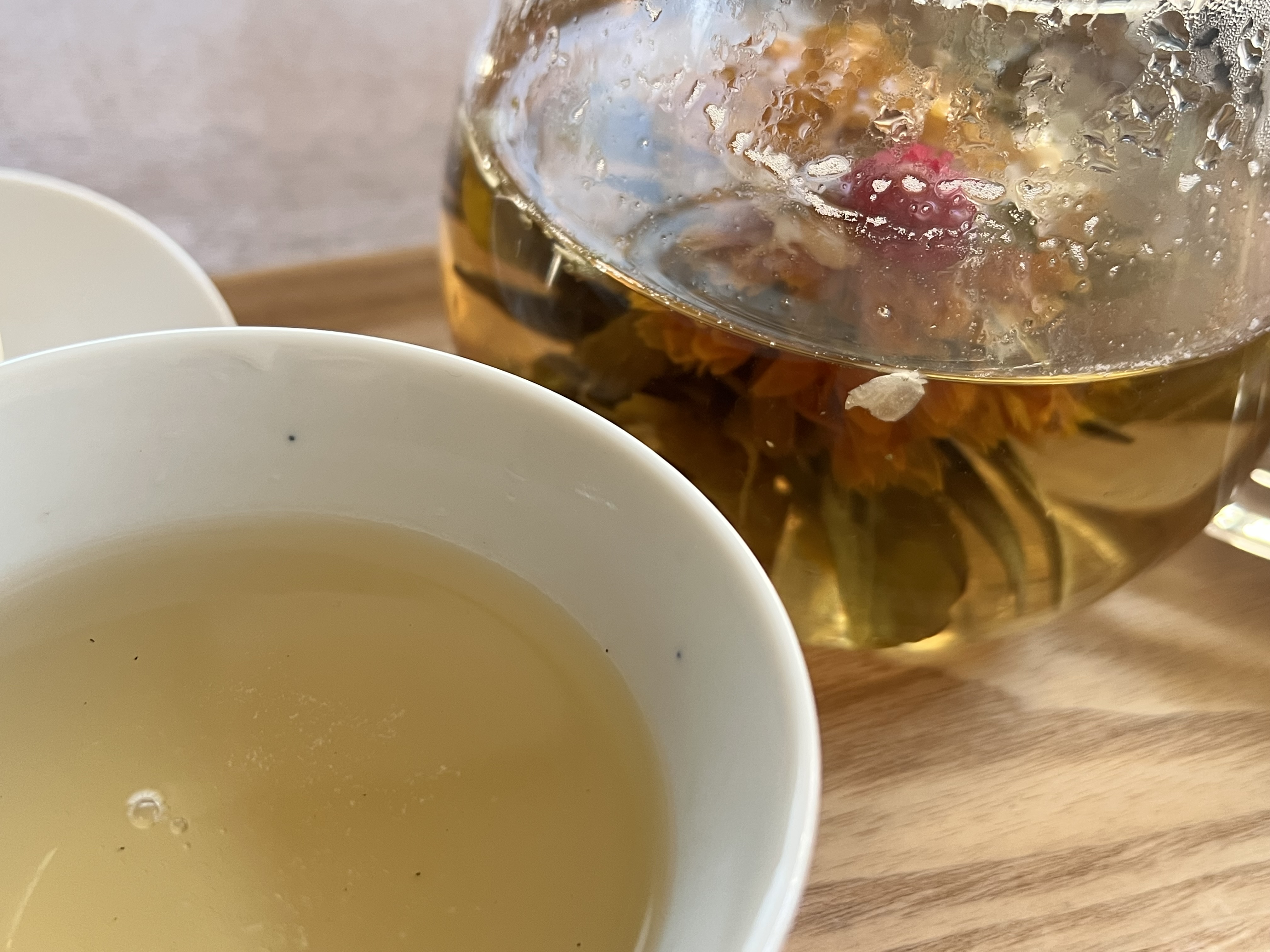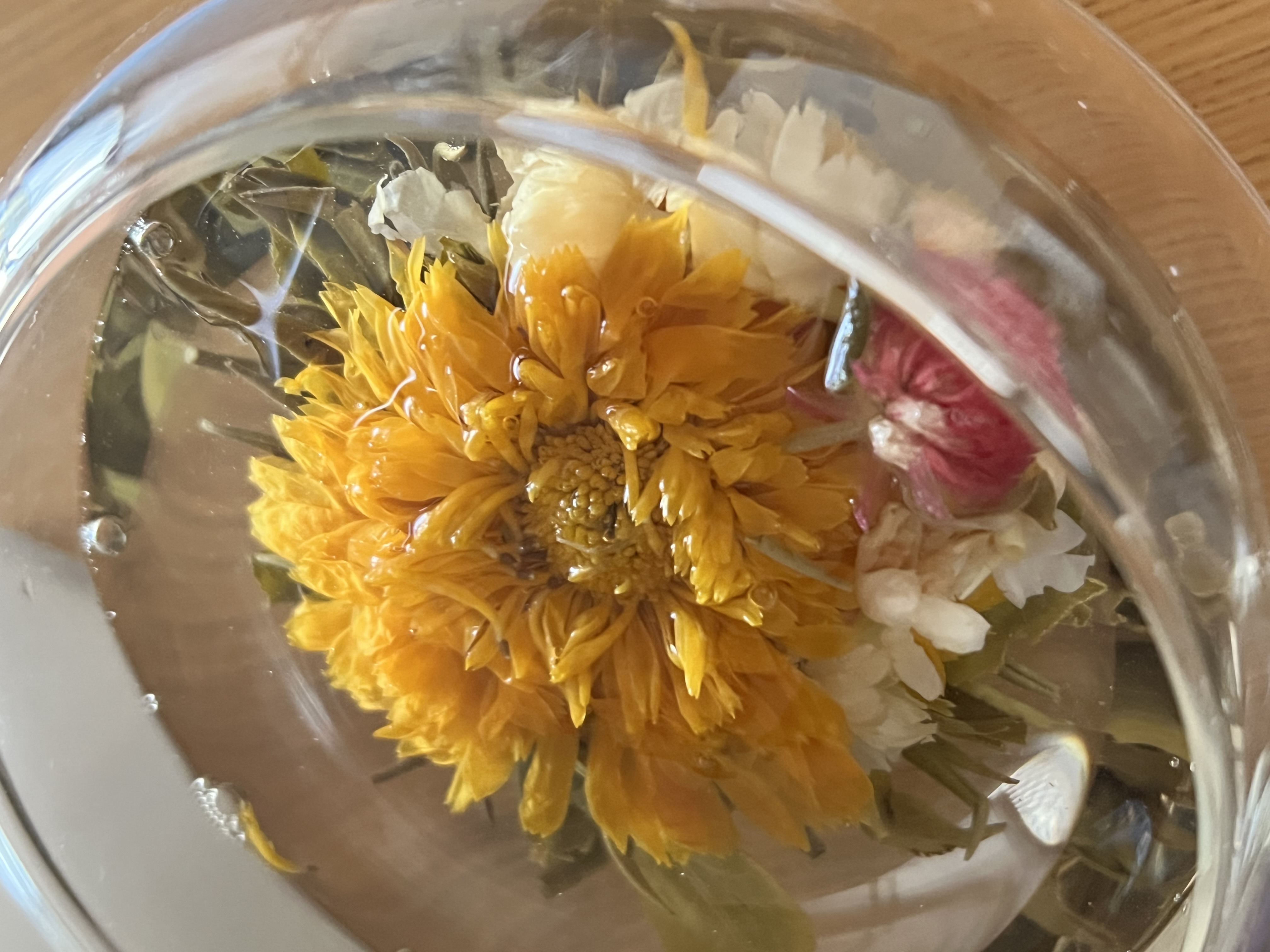 ティーポットに工芸茶を入れてからお湯を注いだら段々花開いてくという、花火のお茶バージョンみたいなやつですね〜!紅茶とかそういうのが好きな人に向いてるかも🫖