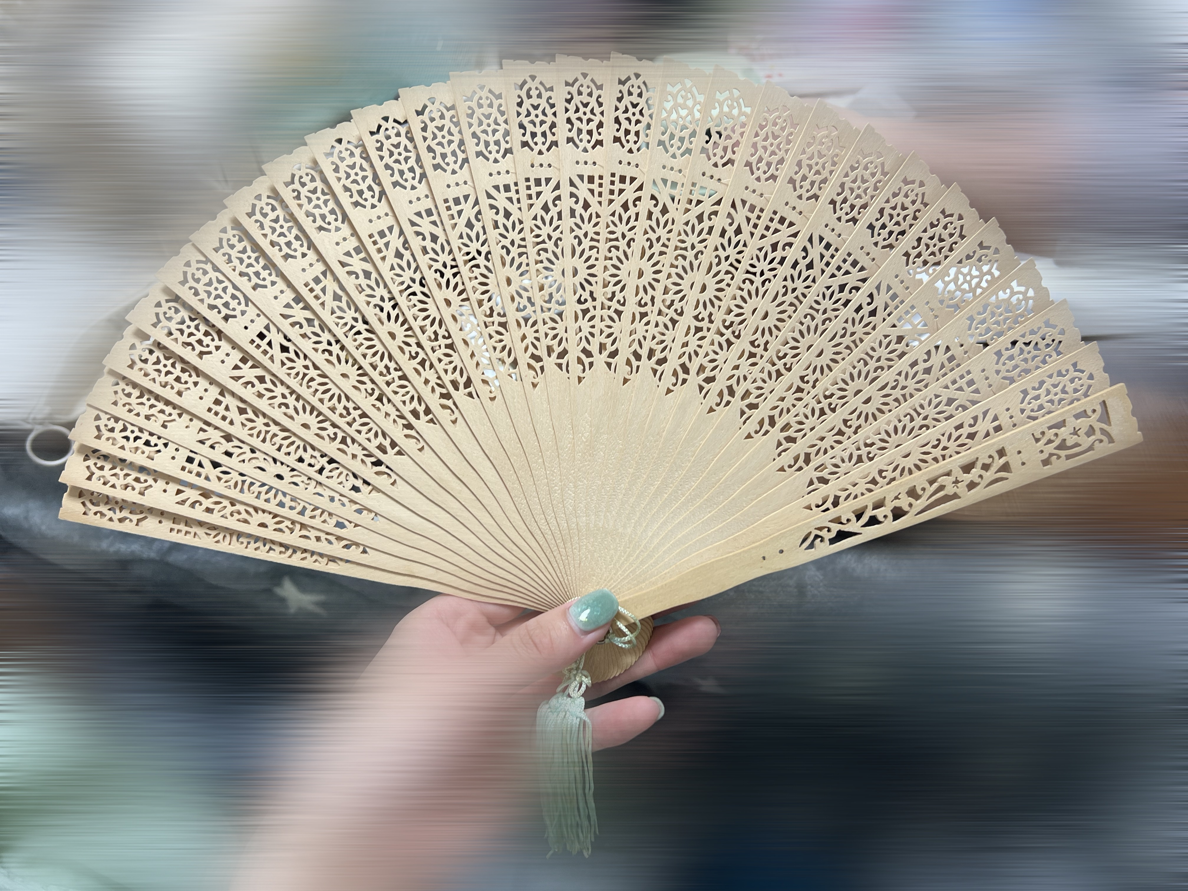 簪4本と扇子と先程申し上げた太極剣です!刃の部分(黒いから見にくいけど)もあったのでいい買い物したな〜と思っています。これで資料が増えた……扇子もビビビッときたやつを買いました!めっちゃ良い、しかも飾り房が緑なんですよ。